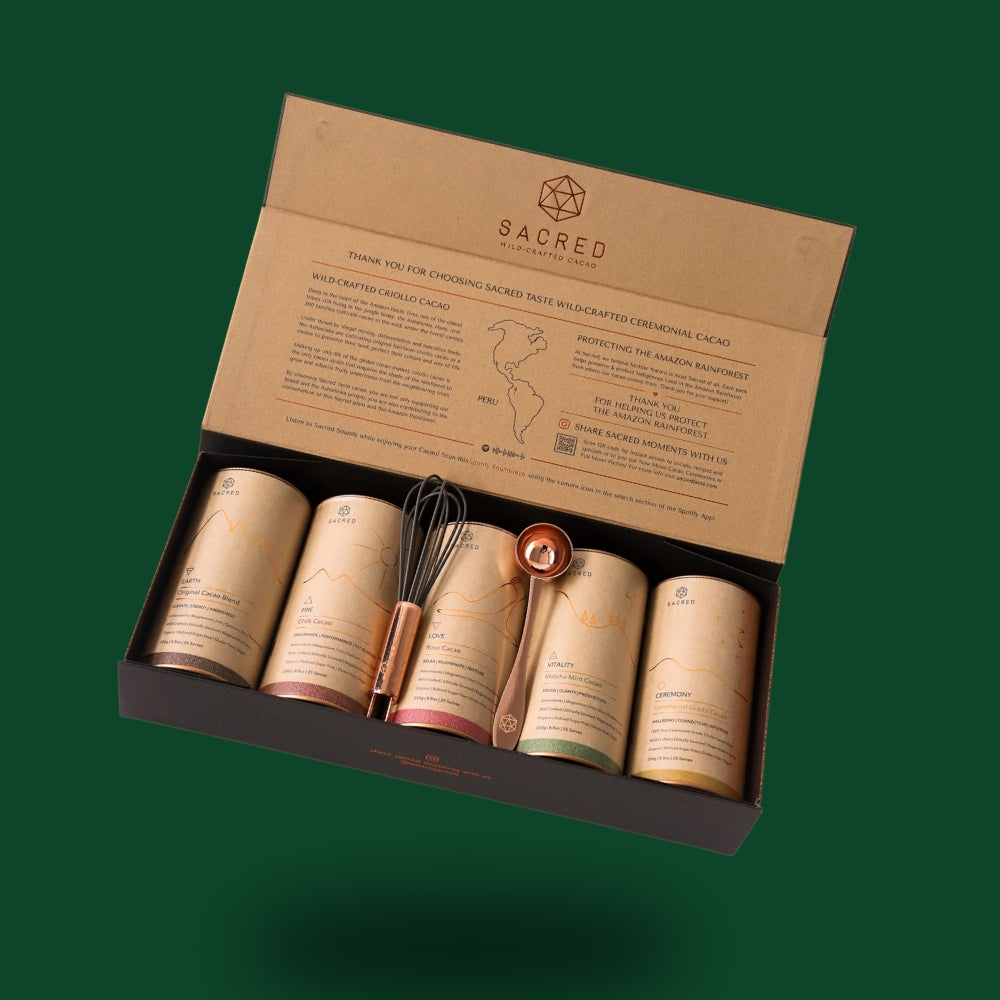 I received this gift box for my 50th birthday and it has been the best present I have ever received. Every day, is a home coming , a chance to centre, align myself and drink in the magic of cacao which is by far the smoothest and tastiest cacao I have ever tasted. It has MASSIVELY calmed my overthinking and anxiety.